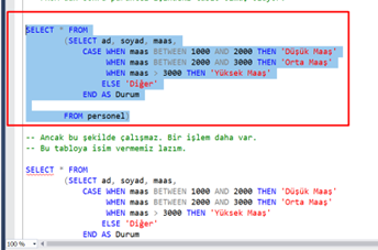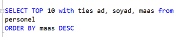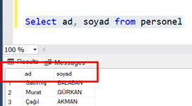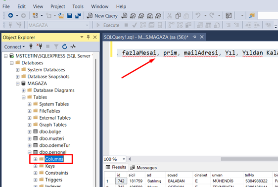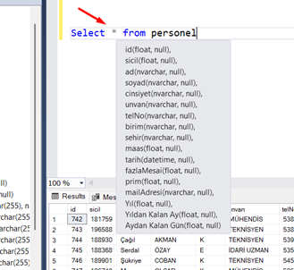 Bir de personel tablosunun kolonlarını sürükleyerek çağırmak istediğimizde aşağıdaki gibi tüm kolonları getirmiş olur. Bunun için Object Explorer’da ilgili tabloda iken Artıya basıp Columns klasörünü olduğu gibi kod ekranına sürükleyebilirsiniz. Ya da Colunms ekranını açıp belirli kolonları da sürükleyebilirsiniz. Yazmak veya sürüklemek hangisi kolayınıza giderse onu yapabilirsiniz.