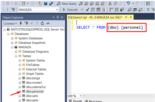 Select * From Personel yazardık. Ancak Sürüklediğimizde [dbo]. Geliyor. Bu kısım Database Şemasıdır. Her ne kadar şema belirlemesek de SQL varsayılan olarak dbo şemasını atar.