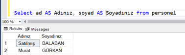 Alias Kullanımı – Kolonlara Farklı isimler Vermek