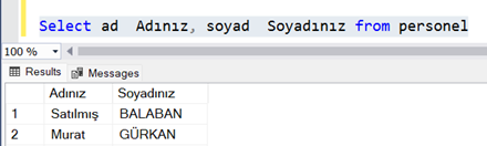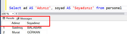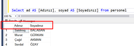 Bunu yapmak için kolon adından hemen sonra AS kullanırız. Boşluksuz kullanacaksınız direk yazabilirsiniz. Ancak boşluklu yazacaksanız Tek Tırnak içinde veya [ Köşeli Parantez] içinde yazabilirsiniz.
