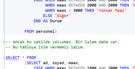Daha önce söylemiştim. F5 tuşu ile SQL kodlarımızı çalıştırırız. Ancak bir dosya da birden fazla SQL kodu varsa ve hepsini çalıştırmak istemiyorsanız sadece o SQL komutunu Shift ile seçerek sadece seçilen kodu çalıştırabilirsiniz. Eğer seçim yapmadan F5 tuşuna basarsanız sayfadaki tüm SQL kodları çalışır.